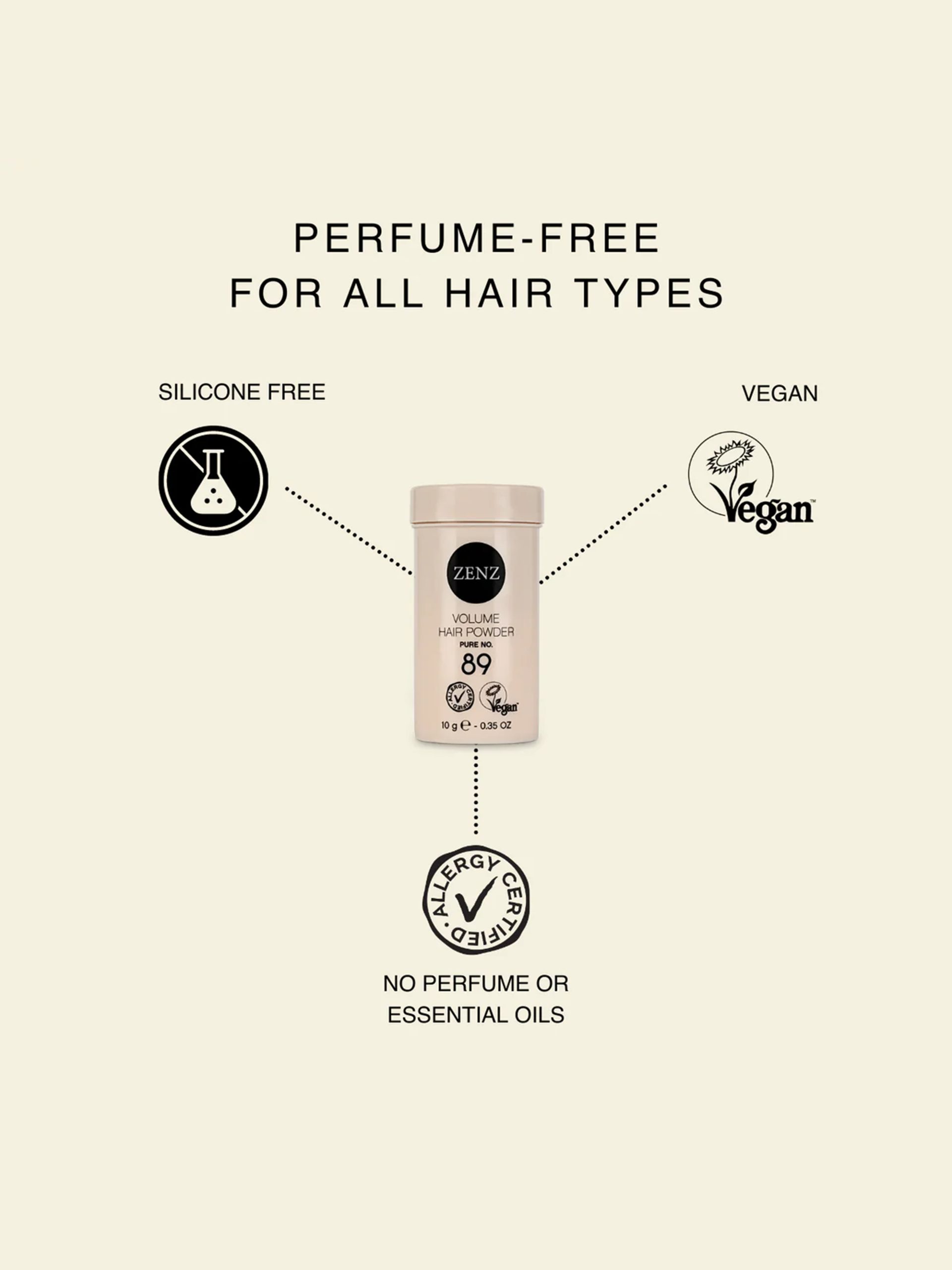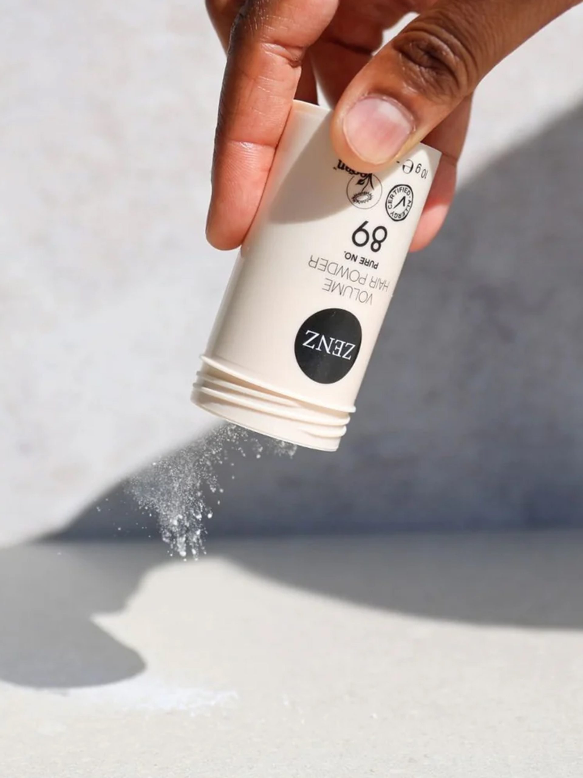 Pure Copenhagen Hair Powder No. 89 från danska Zenz. Det är ett svan- och allergimärkt hårpuder som ger maximal fyllighet och stadga i både kort och långt hår. Pudret absorberar smuts och fett från hårstråna, vilket ger håret ett rent och friskt utseende. Volume Hair Powder no. 89 är ett hårpuder för alla hårtyper. Speciellt lämpligt för att ge volym till platt hår.